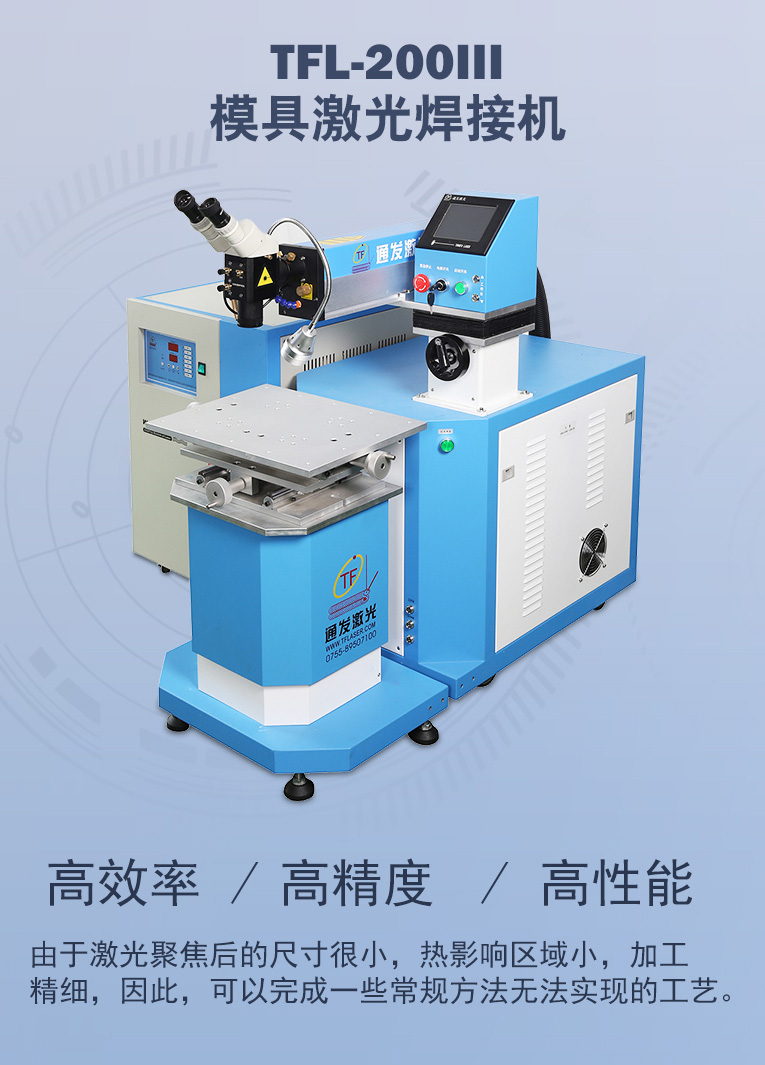 TFL-200Ⅲ型模具激光焊機是通發(fā)激光公司在TFL-180Ⅲ的基礎(chǔ)進行了改良,采用通發(fā)自主研發(fā)的二代精密單燈電源為燈泵浦驅(qū)動電源,配置觸摸屏,操作更方便。主機具備激光頭手搖升降與工作臺按鈕電動升降實現(xiàn)焊接不同厚度模具的激光焊加工。本款機型更適用于各類高精密注塑模具激光補焊,精密塑膠模具零件激光修補,塑膠模具鈹銅零件激光燒焊;可對模具使用過程中出現(xiàn)的磨損進行激光修復;對機械加工失誤、電火花加工失誤,模具減膠設(shè)計變更等需要對模具修改,起到關(guān)鍵的作用,可彌補因加工失誤造成的巨大損失。